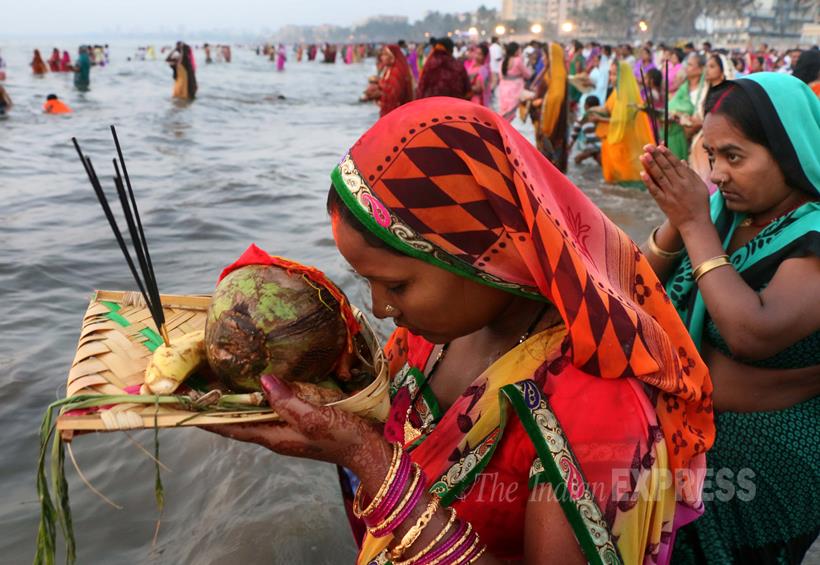 People offering prayers to Sun God during Chhat festival at Juhu Beach Mumbai . Express Photo by Amit Chakravarty 17-11-15, Mumbai