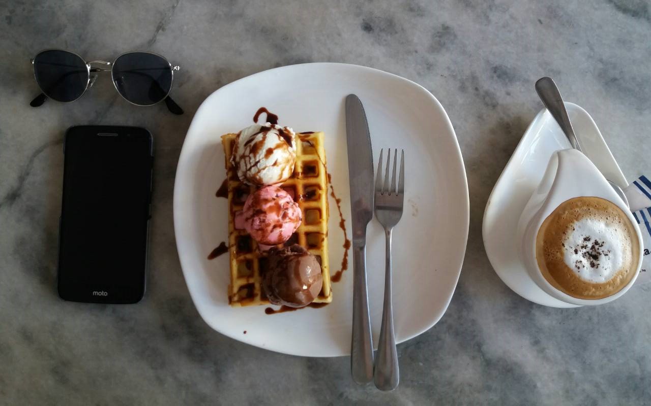 Their menu contains a variety of food ranging from caffeinated drinks to pasta and pizzas, but it is their ice-cream waffles that steal the show. Reasonably priced at Rs 200, the ice cream waffles here come out fresh and hot topped with not one, not two but three scoops of ice-creams; there are vanilla, chocolate, and strawberry. And, to complete the whole thing more than to make them look enticing, the ice creams get a generous splash of chocolate sauce.