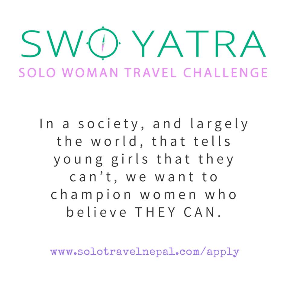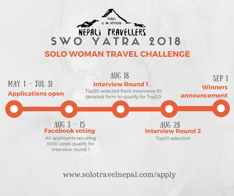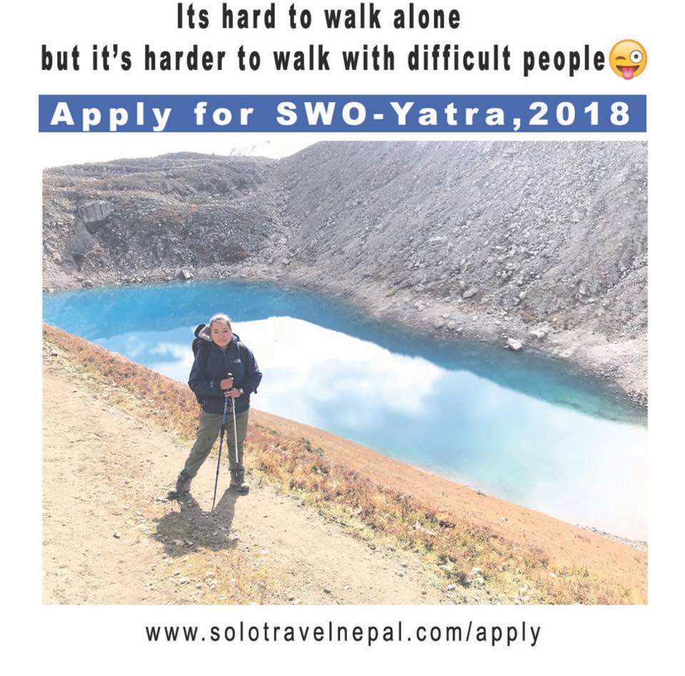 This year Nepali Travellers is taking applications for SWO-Yatra 2018, Solo Woman Travel Challenge till 31st July 2018.