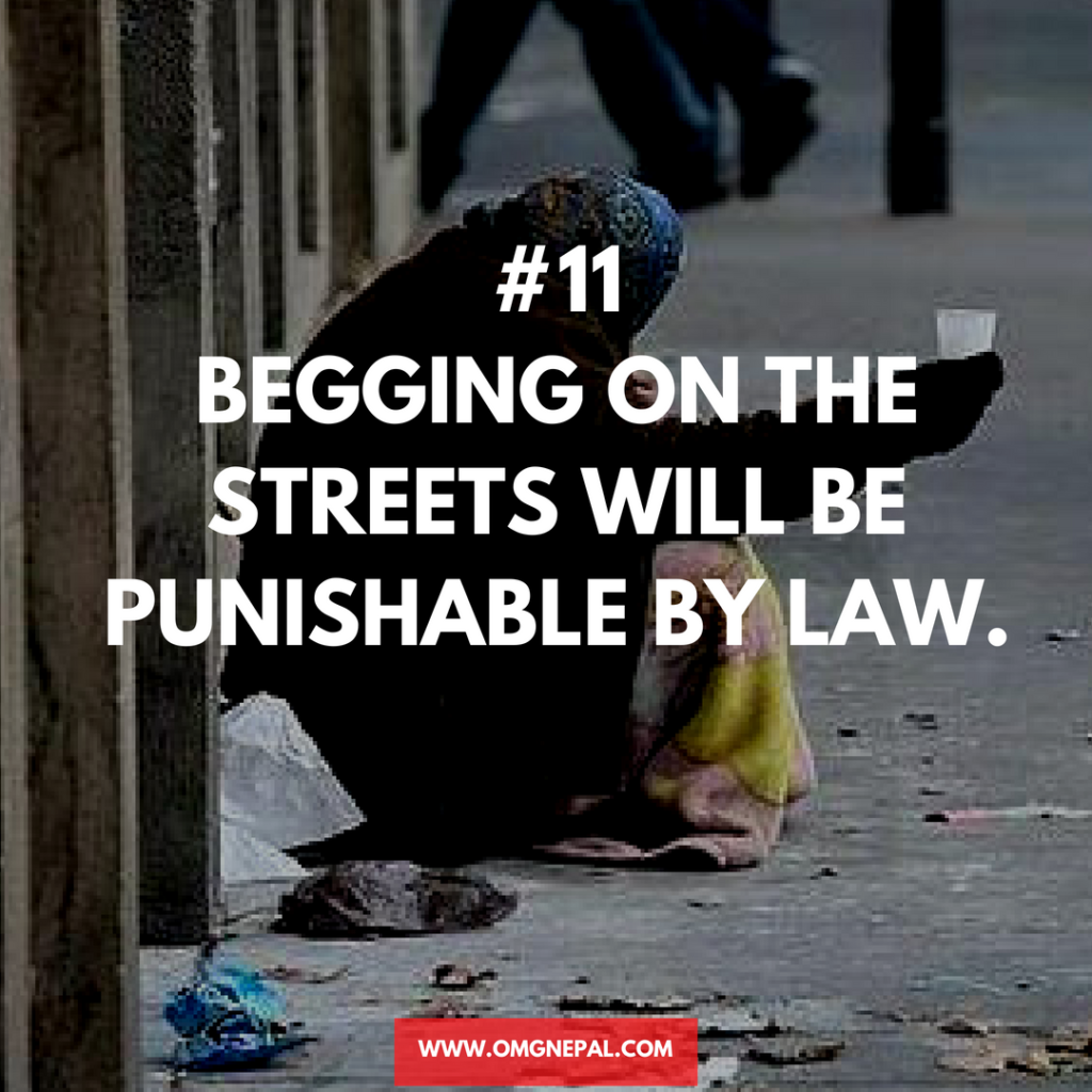 “Street begging has been banned completely. Anyone found begging or forcing someone to beg in the public places can face a jail term of one month and a year respectively. Authorities had already enforced a similar law inside the Pashupatinath temple premises earlier this year, but it hasn’t been fully implemented yet.”