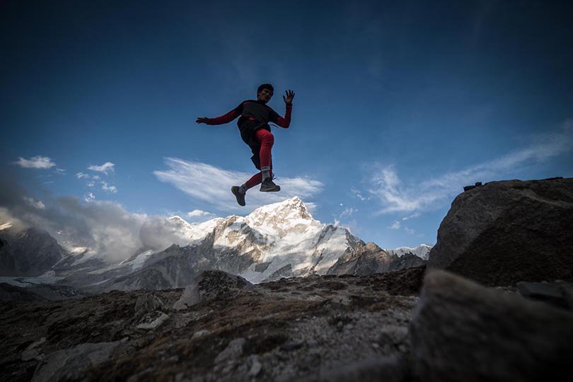 Sports Mode, First Place- Pratik Rayamajhi. The mountain seen in the background with the participant on air in the Everest Marathon Championship.